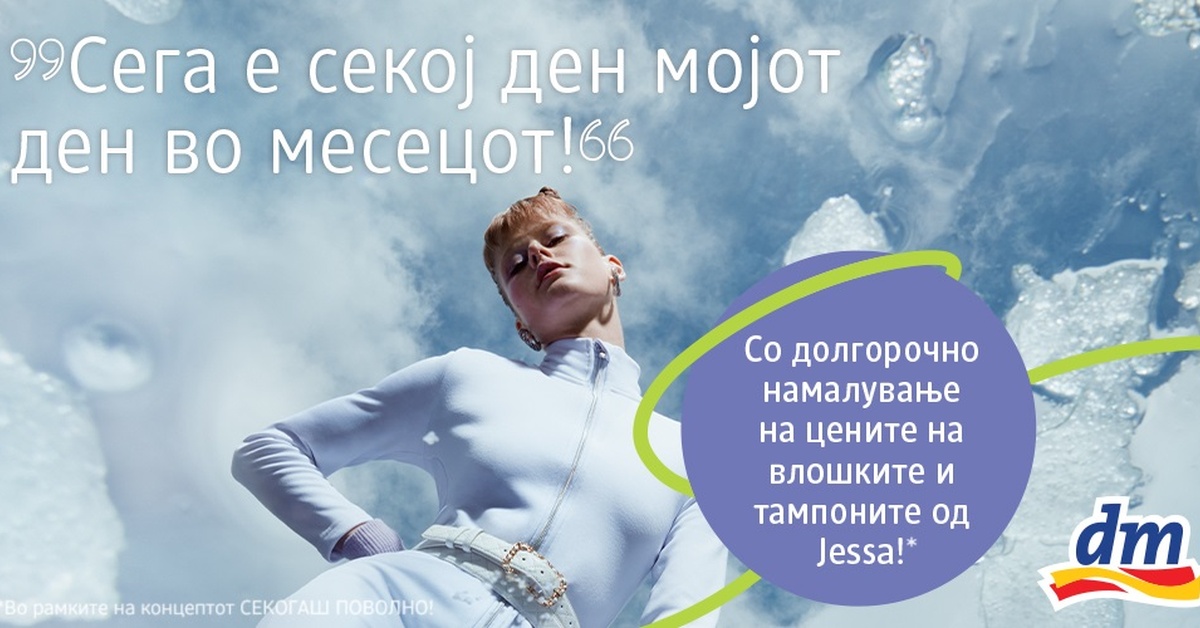 Со цел да ја поттикне менструалната правда, најголемиот дрогериски ланец во Европа - dm drogerie markt, од 1 февруари 2024 долгорочно ги намалува цените на влошките и тампоните од сопствената трговска марка Jessa, во рамките на ценовниот концепт СЕКОГАШ ПОВОЛНО. Покрај веќе поволните цени за производите вклучени во овој ценовен концепт, dm има за цел да придонесе за намалување на менструалната сиромаштија кај нас преку формирање на уште поповолни цени за овие производи.