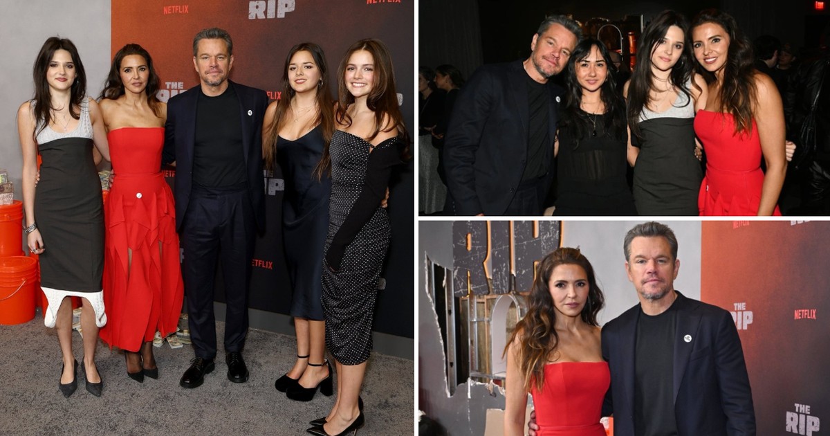 Мет Дејмон со сопругата и четирите пораснати ќерки на премиерата на „The Rip“