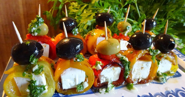 - Коцките сирење замотајте ги во ленти пиперки. Прободете ги со чепкалка за заби и одгоре ставете маслинка.