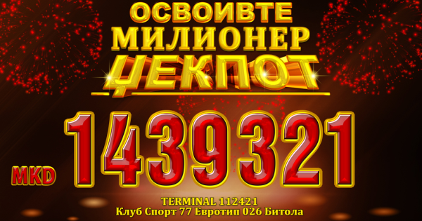 Битолчанецот Д. Н. стана милионер. Дваесет и едногодишното момче се израдува на 18-тиот МИЛИОНЕР ЏЕК ПОТ на ДВЛМ. Добивката вредна 1.439.321 денари ја освои во Клуб Спорт 77 Евротип во Битола на 30.10.16.