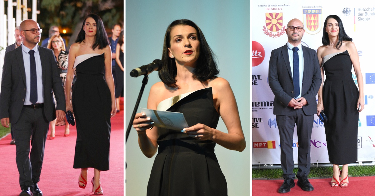 На отворањето на манифестацијата во Битола, министерката за култура зачекори на црвениот тепих во елегантно издание. Асиметричниот црн фустан со бел детаљ таа го искомбинира со минималистички сандали во црвена боја.