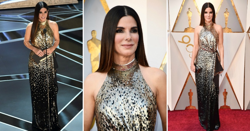 53-годишната ѕвезда шармираше во црно-златен фустан од Луј Витон. Во својот стајлинг, Сандра додаде и дијамантски накит од Лорејн Шварц.