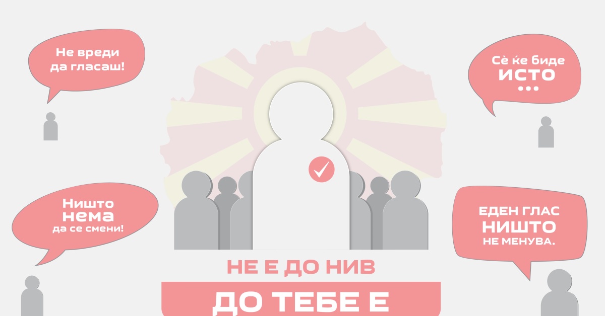 „Не вреди да гласаш“, „Нема ништо да се смени“, „Еден глас ништо не менува“, „Сѐ ќе биде исто“... И така до недоглед, може да се набројуваат изговори кои нѐ делат од иднината што ја посакуваме и која можеме сами да ја креираме, затоа не е до нив, до тебе е - гласај без изговори.