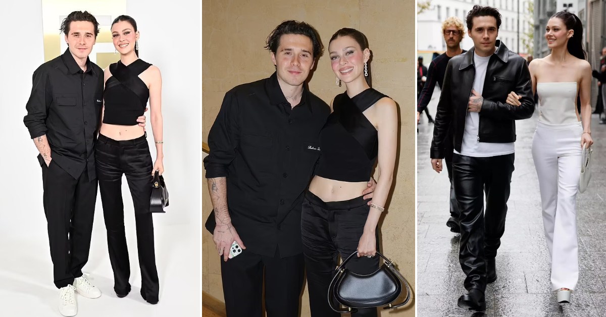 25-годишниот син на Дејвид и Викторија Бекам и неговата 29-годишна сопруга во црни стајлинзи пристигнаа на модното шоу на француската модна куќа. Никола носеше модна комбинација со краток топ.