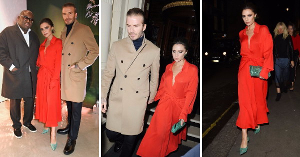 Викторија беше придружувана на забавата од сопругот Дејвид, сестра си Луиз и родителите Тони и Џеки Адамс.