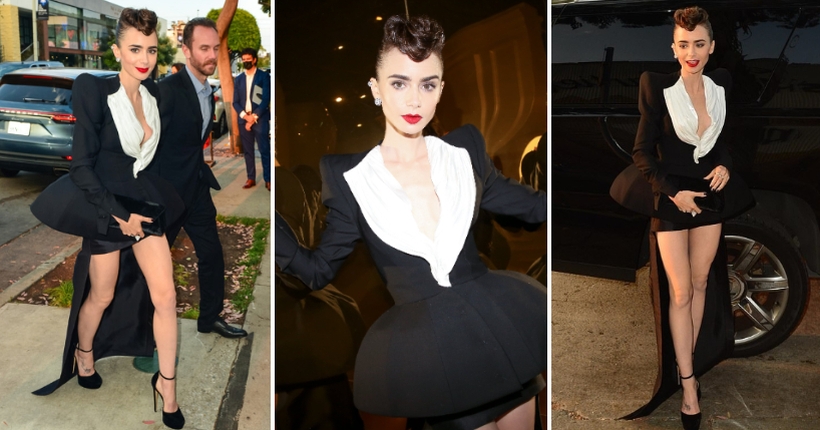 Актерката од „Emily in Paris“ со впечатлив стајлинг привлекуваше погледи на настанот во Лос Анџелес. Црно-белата креација на 32-годишната убавица доаѓа од модната куќа Ronald van der Kemp.