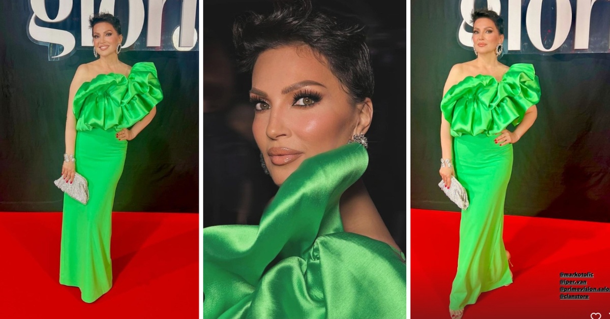 На прославата во Загреб, 51-годишната пејачка блесна во долга зелена тоалета со впечатлив волуменозен горен дел.