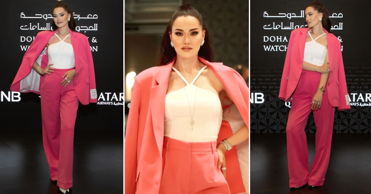 Модерна ѕвезда: Турската актерка Фахрие Евџен во розов костум на изложба на накит во Катар