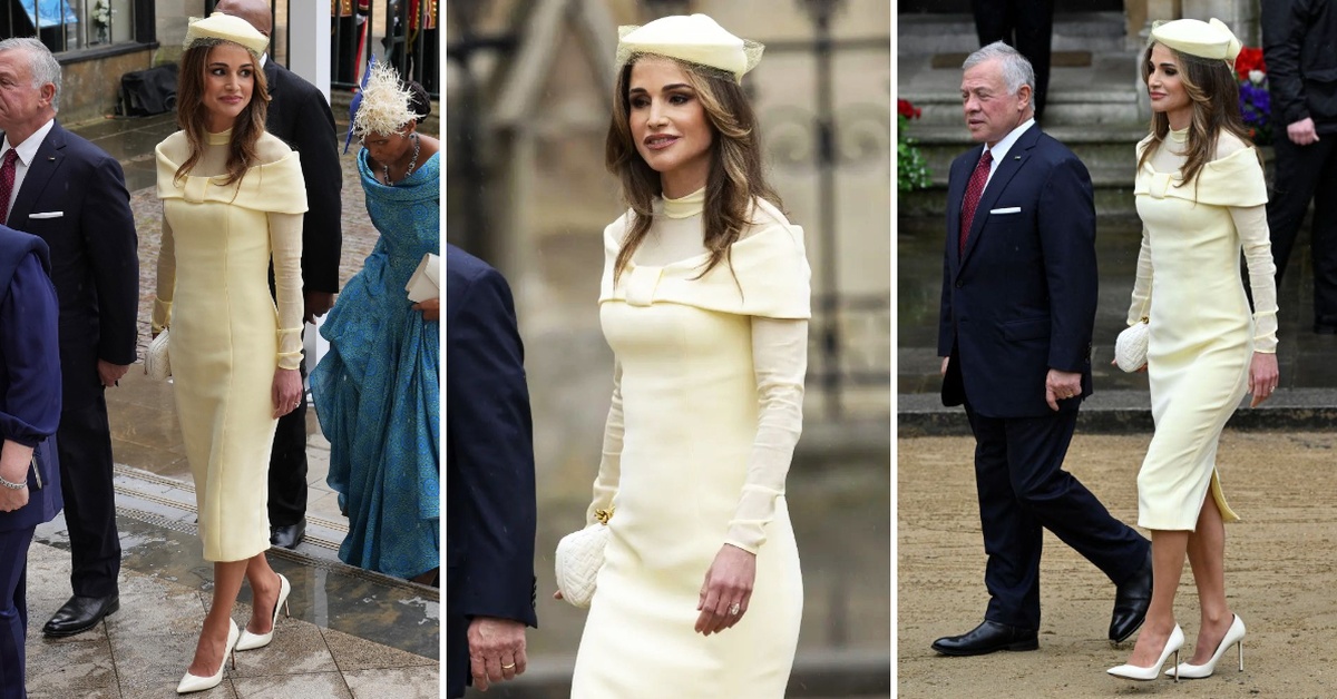 52-годишната Кралица на Јордан блескаше во едноставна креација во млечно жолта нијанса од Тамара Ралф, складна шапка и бели салонки.