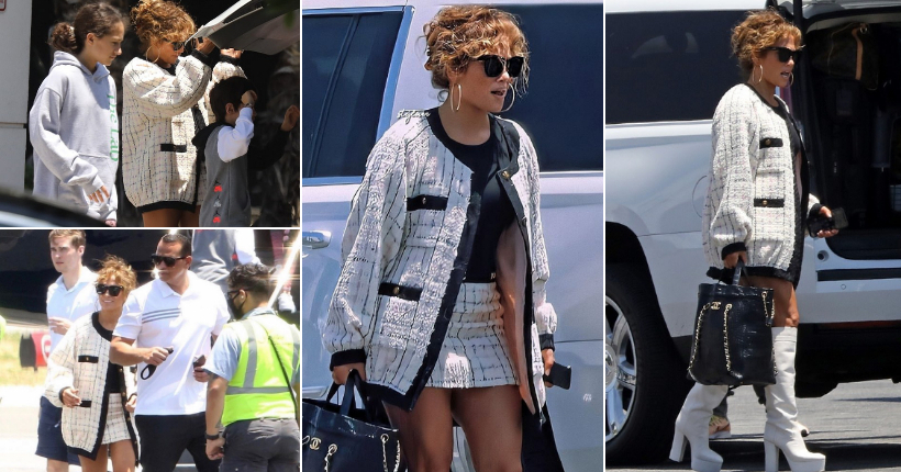 50-годишната пејачка и актерка беше фотографирана во Лос Анџелес додека се качуваше во приватен авион со Алекс Родригез и близнаците Макс и Еми. Славната ѕвезда носеше модна комбинација со кратко здолниште од Шанел која ја комбинираше со високи бели чизми.