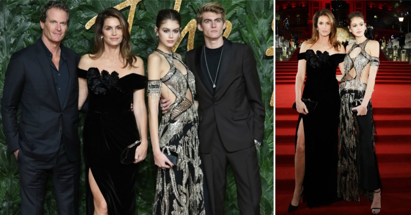 На црвениот тепих, 52-годишниот супермодел се појави во црн фустан од Marchesa, додека 17-годишната Каја зачекори во креација од Alexander McQueen.