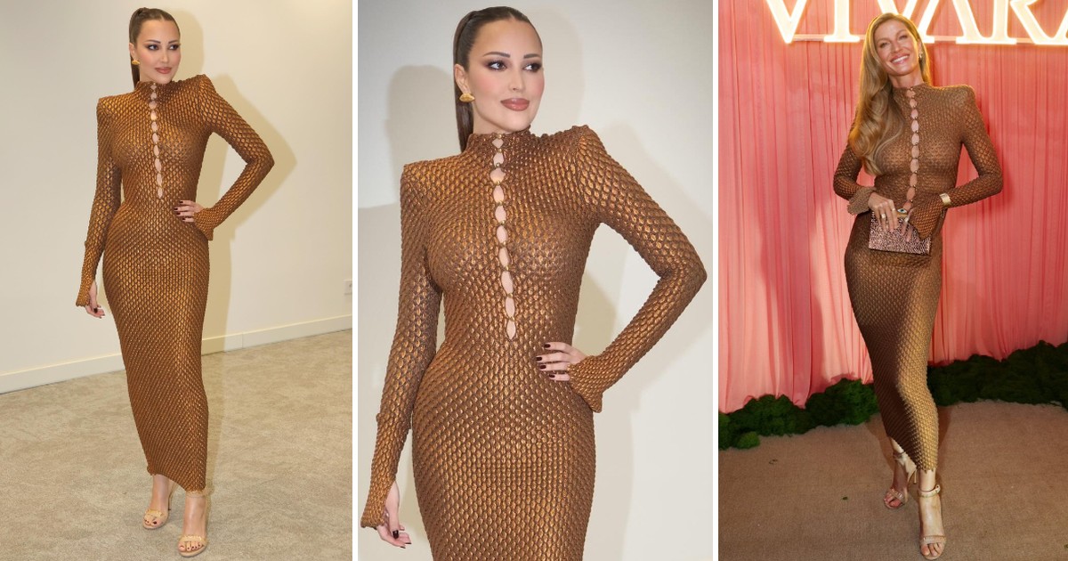 Бронзената креација со раскошна текстура пред две недели беше модниот избор и на Жизел Бундшен. Легендарниот супермодел го носеше фустанот на празничната забава на брендот Vivara во Саун Пауло.