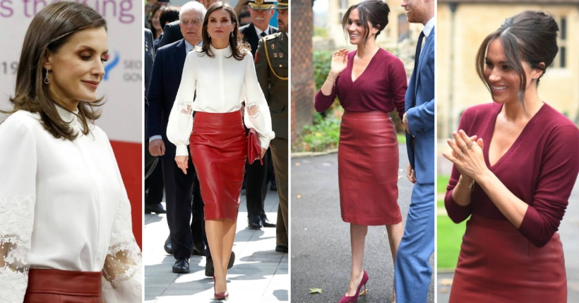Кралицата Летиција vs. Војвотката МеганКралицата Летиција носеше здолниште од Хуго Бос на политички настан во Јужна Кореја. Кожената бордо креација таа ја искомбинира со бела кошула со широки ракави и детали со тантела.