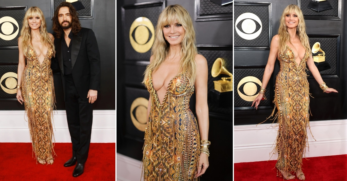 49-годишниот супермодел избра фустан со златни синџири од The Blonds и складни сандали од Tom Ford за настанот на кој беа наградувани најдобрите во светот на музиката. Убавата Германка беше придружувана од сопругот Том Каулиц, кој имаше целосно црн стајлинг.