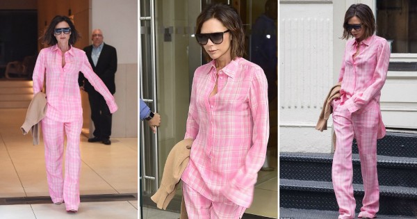 Розовиот комплет од колекцијата ресорт 2018, кој е во пижама стил, ги подели обожавателите. Викторија беше фотографирана со синот Ромео во Њујорк.