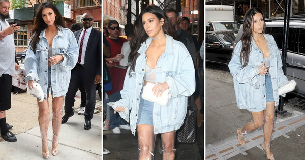 35-годишната ѕвезда од „Keeping Up with the Kardashians“ го привлече вниманието со необичен стајлинг. Њујоршките папараци ја фотографираа во волуменозна фармерска јакна, проѕирен син градник, кратки џинс панталони и високи проѕирни чизми кои се дело на нејзиниот сопруг Кание Вест.