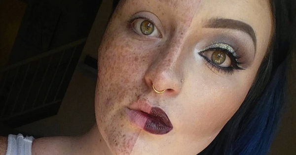 Девојка која има многу пеги целосно си ја преобрази едната половина од лицето со помош на шминка, а фотографијата брзо се распространи на социјалните мрежи.