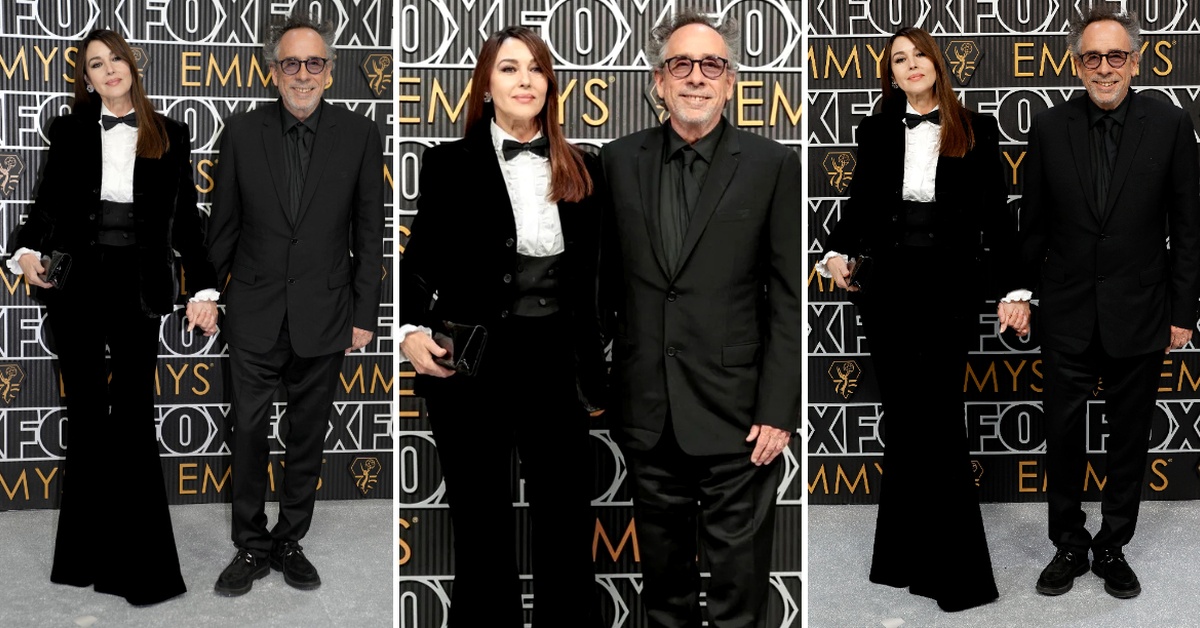 Моника Белучи и Тим Бартон во координирани стајлинзи зачекорија на сивиот тепих на Еми 2024.