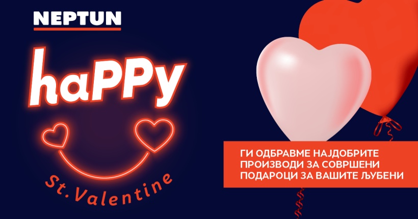 На само еден ден пред Св. Валентин вие сѐ уште немате идеја за подарок за вашите љубени? Нептун Македонија оваа година ќе го олесни вашиот избор за совршен подарок. По повод “Денот на вљубените”, до 14 февруари, во Нептун продавниците ширум Македонија има голема „haPPy St. Valentine” акција со огромен избор на производи со големи попусти за супер големи заштеди! Посетете ги Нептун продавниците и направете го вистинскиот избор овој Св. Валентин и изненадете ги вашите љубени.
