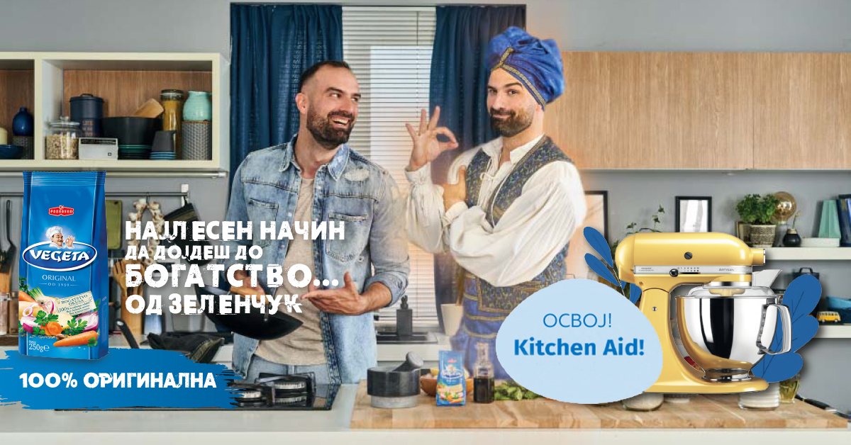 Некогаш мала тајна, а денес голема помош во кујната. Веќе 60 години заедно со Vegeta создаваме, уживаме и споделуваме со оние кои ги сакаме. Vegeta таквата верност ја наградува со вкусни јадења кои успеваат секој пат, но и со вредни награди. Споделете го вашиот омилен рецепт и учествувајте во наградната игра „100% едноставна - 100% оригинална“, во која ќе можете да ја добиете главната награда - Kitchen Aid( универзален кујнски апарат – мултипрактик) или богат пакет со подароци од Vegeta.