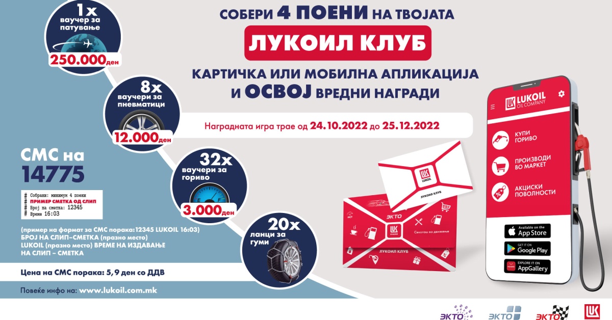 За наградната игра „Собери 4 поени на твојата ЛУКОИЛ КЛУБ картичка или мобилна апликација и освој вредни награди”.