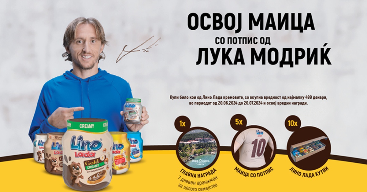 Во периодот од 20.06.2024 до 20.07.2024 година, купете Лино Лада кремови и освојте маица потпишана од фудбалерот Лука Модриќ, кој оваа година е амбасадор на брендот Лино Лада. Покрај маици, можете да освоите и други вредни награди: седумдневен аранжман за целото семејство во хотелот „Инекс Олгица“ во Охрид и Лино Лада кутии со сите вкусови на петте кремови.
