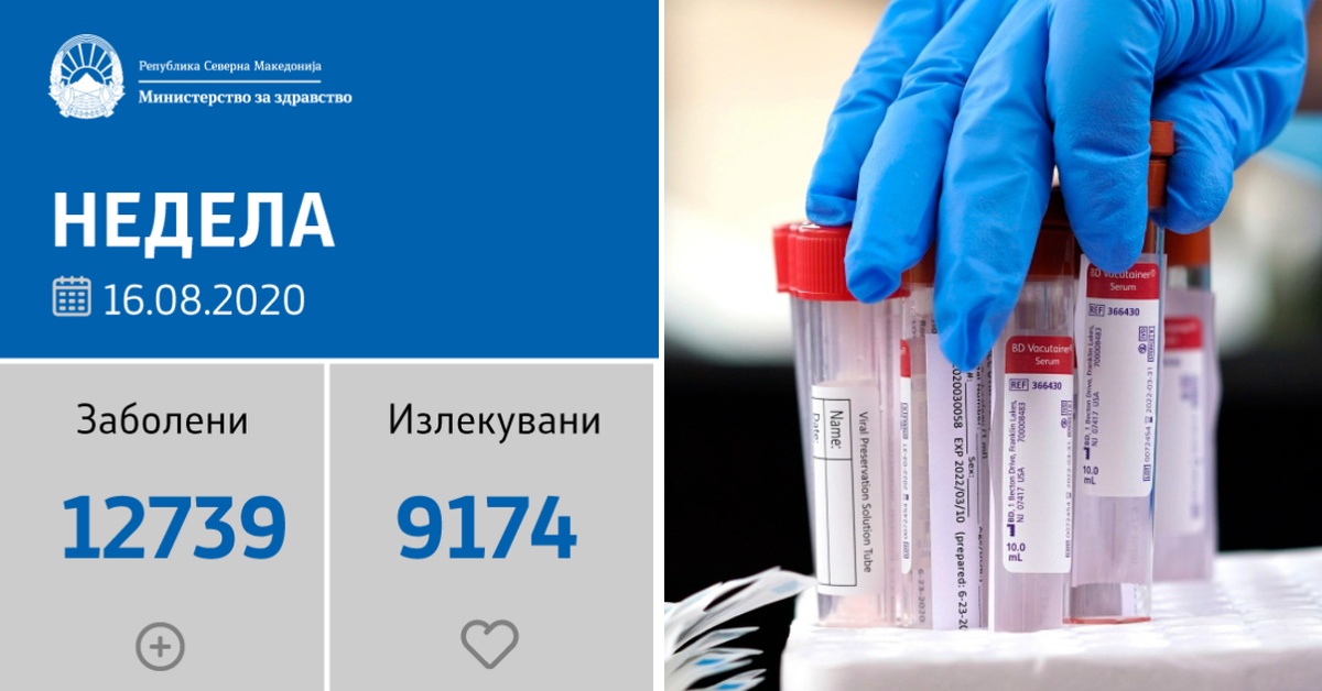 Вкупната бројка на ковид дијагностицирани во нашата земја од почетокот на епидемијата изнесува 12.739, бројката на оздравени пациенти е 9.174, на починати е 544, а во моментов бројот на активни случаи во земјата изнесува 3.021.