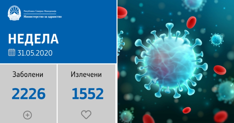 Вкупната бројка на дијагностицирани во нашата земја од почетокот на епидемијата изнесува 2.226, бројката на оздравени пациенти е 1.552, на починати е 133, а во моментов, бројот на активни случаи во земјата изнесува 541.