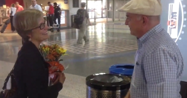 Внимателен сопруг со серенада и букет цвеќе ја пречека својата сакана на аеродром и допре до срцата на присутните, кои ја снимија романтичната случка.