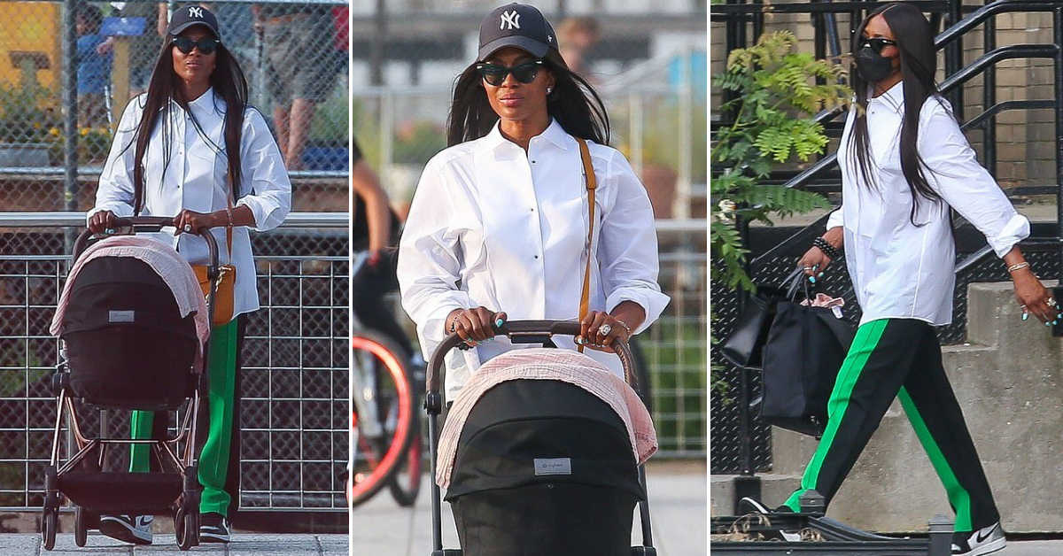 50-годишната манекенка беше фотографирана во Њујорк на првата прошетка со бебенцето, кое го доби во мај годинава. Славниот супермодел носеше бела кошула од Долче и Габана и црни панталони со зелени линии.