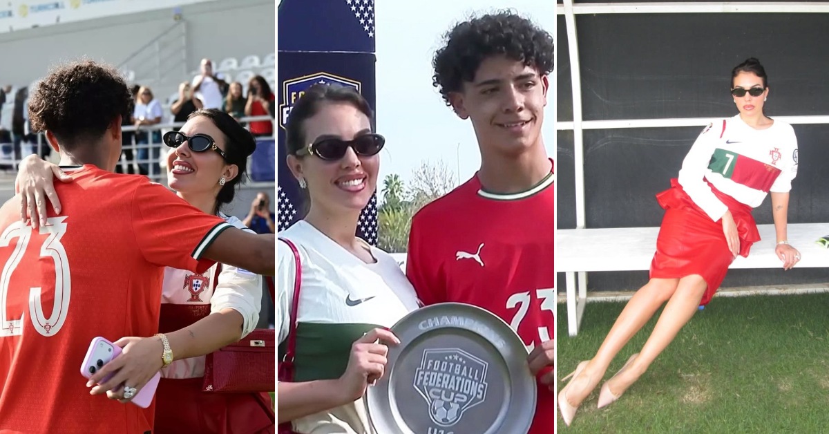Џорџина Родригез не пропушти да присуствува на овој важен турнир на нејзиниот најголем син. Облечена во црвено кожно здолниште и маица со името на Роналдо, таа навиваше и славеше од трибините.