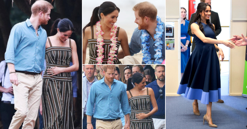 37-годишната поранешна актерка и 34-годишниот принц ја посетија плажата Бонди. Бремената Меган избра долг фустан со риги од Martin Grant, обувки од Castaner Wedges и накит од Adina Reyter и Missoma.