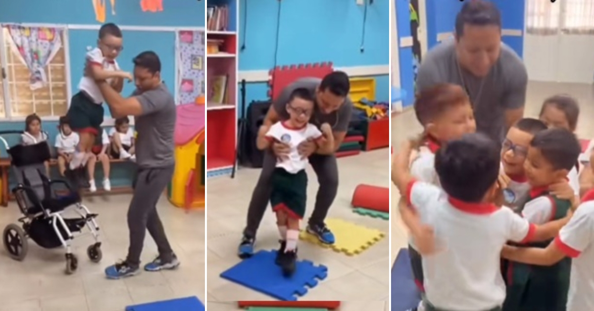 Наставник доби бројни комплименти што му помогна на момче во инвалидска количка да се чувствува вклучено во наставата. Во слаткото видео, тој го подигнува малиот Ноа додека другарчињата го извикуваат неговото име и заедно „скокаат“ низ училницата.