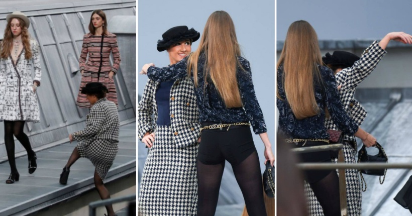 Имено, додека моделите дефилираа, на пистата се качи и жена, за која подоцна беше потврдено дека е француската комичарка Мари.
