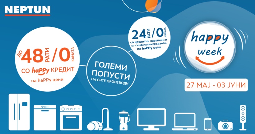 HAPPY WEEK акција во „Нептун" со големи попусти и до 48 рати без камата на сите производи! Од 27.05-03.06, потрошувачите ќе може да купуваат по промотивни – haPPу цени со големи попусти и до 48 рати без камата со haPPy кредитот или до 24 рати без камата со кредитни картички и со синдикална продажба.