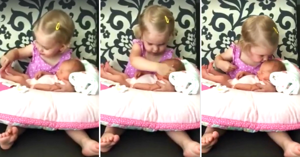 Во него, малата Ела ѝ пее на новородената сеста Одри, галејќи ја на нозете, рачињата и главчето. Видеозаписот беше споделен на Facebook страницата „Love What Matters“ од мајката на девојчињата.