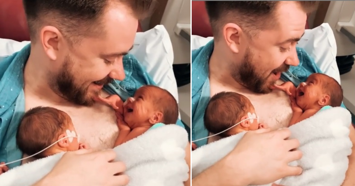 Во видеото, новородено бебенце му се насмевнува на татко си додека тој го држи во прегратка заедно со неговото братче-близнак.