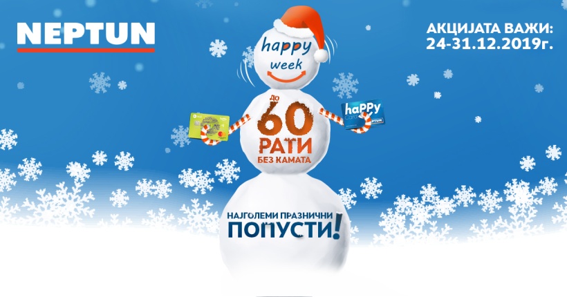 HAPPY WEEK акција во Нептун со најголеми празнични попусти и до 60 рати БЕЗ камата на цените со попуст! Од 24-31декември, до 60 рати без камата со haPPy кредитот или до 24 рати без камата со кредитни картички и синдикална продажба, потрошувачите ќе можат да си ги купат потребните производи по промотивни цени со големи попусти.