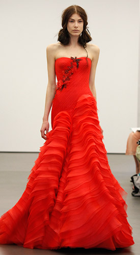 „Белата“ модна недела донесе на пистите модели за секоја гламурозна невеста – елегантни фустани со „А“ линија за невестите кои сакаат изглед на принцеза, секси фустани со силуета на сирена за оние кои се гордеат со својата фигура, раскошни фустани со многу набори и волумен за оние кои сакаат да остават силен впечаток и црвени фустани за невестите кои не се плашат да бидат поразлични. Да, да, малку невообичаено, но еден од трендовите кои беа поставени се црвените невестински фустани. Се прашувате кој е „виновник“ за тој тренд? Кој друг ако не незаменливата Вера Ванг. Црвениот тренд го поддржа и Оскар де ла Рента, кој исто така претстави венчаници обоени во бојата на љубовта.