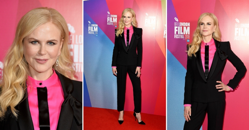 51-годишната филмска ѕвезда мамеше погледи на црвениот тепих на премиерата на „Destroyer“ во Лондон. Модната комбинација на Никол вклучуваше црн костум од Џорџо Армани и циклама кошула.
