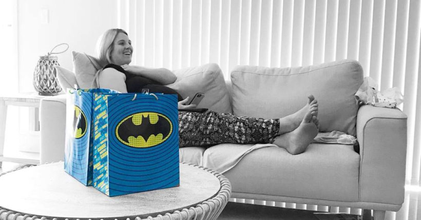 Во преден план на фотографијата има кеси со Бетмен. Тие се полни со подароци од малиот брат за поголемите батковци. Така таа сакаше да го помине последниот ден од бременоста...