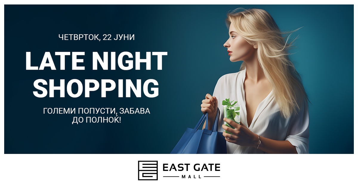 За сите љубители на шопинг, забава и одлична музика, East Gate Mall на 22 јуни, четврток организира шопинг до полноќ. Трговскиот центар го продолжува своето работно време од вообичаено сѐ со цел посетителите да уживаат во забавата и поинакво шопинг искуство.
