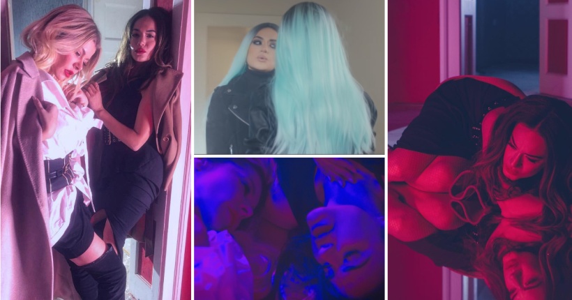 Во видеозаписот, музичките ѕвезди се појавуваат и во идентична облека и со сини коси.