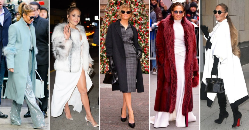 Модниот спринт на Лопез продолжува со комбинација во која црнобелата наметка е дело на модната куќа Валентино, чизмите се со потпис на Кристијан Лобутин, чантата доаѓа од Ермес, а очилата за сонце се Шанел.