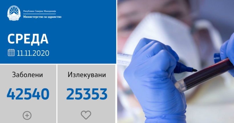 Вкупната бројка на ковид дијагностицирани во нашата земја од почетокот на епидемијата изнесува 42.540, бројката на оздравени пациенти е 25.353 на починати е 1.212, а бројот на активни случаи изнесува 15.975.
