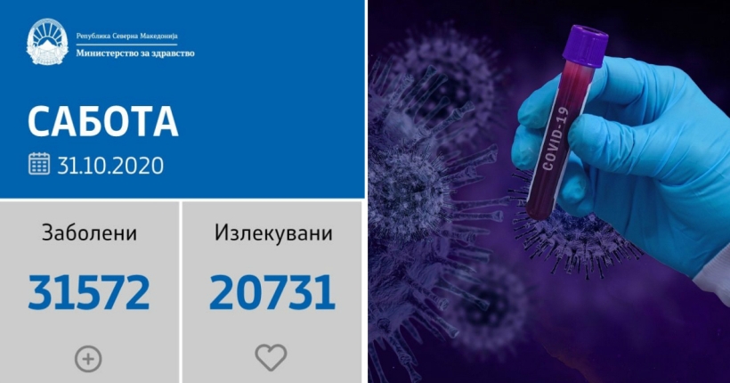 Вкупната бројка на ковид дијагностицирани во нашата земја од почетокот на епидемијата изнесува 31.572, бројката на оздравени пациенти е 20.731, на починати е 994, а бројот на активни случаи изнесува 9.847.