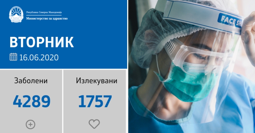 Вкупната бројка на дијагностицирани со КОВИД-19 во нашата земја од почетокот на епидемијата изнесува 4.289, бројката на оздравени пациенти е 1.757, на починати е 201, а во моментов бројот на активни случаи во земјата изнесува 2.331.
