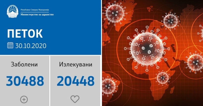 Вкупната бројка на ковид дијагностицирани во нашата земја од почетокот на епидемијата изнесува 30.488, бројката на оздравени пациенти е 20.448, на починати е 982, а бројот на активни случаи изнесува 9.058.