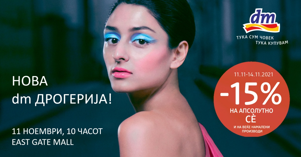 Од 11 па сѐ до 14 ноември, во новата дрогерија на dm, која ќе биде отворена во EAST GATE MALL – Ул. Беласица бр. 2, ќе може да уживате во неодоливи попусти од: