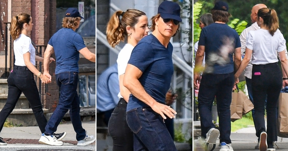 63-годишниот актер и 37-годишната актерка беа фотографирани додека рака за рака шетаа во Вермонт. Двајцата беа облечени во лежерни комбинации со фармерки, а Том на главата носеше капче.